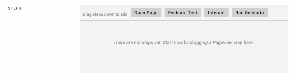 Start by switching to the Scenarios tab and select "Create Scenario". The Scenario needs at least a name, but you can also start adding steps. For example, try adding an Open Page step to navigate to a URL.